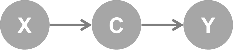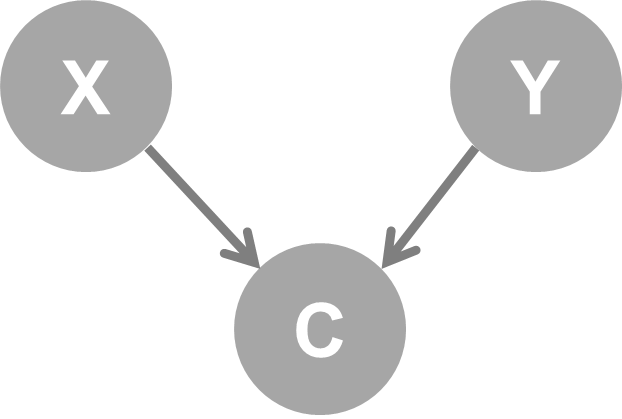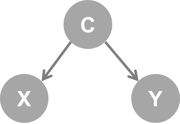 세 변수 간 conditioning independence를 확인하였을 때, $X \not\perp\!\!\perp Y$이고 $X \perp\!\!\perp Y | C$ 라면 $X$,$Y$,$C$의 관계를 확정할 수 없습니다. 세 변수 간 Chain, Fork 형태 둘 다 가능하기 때문입니다.