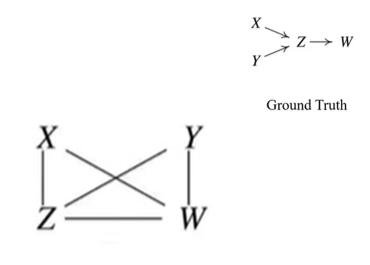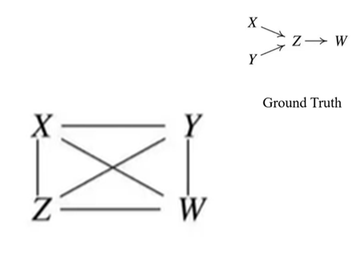 이제 주어진 데이터에서 변수 간 conditioning independence check를 통해 causal diagram을 도출하는 알고리즘 중 하나인 PC 알고리즘을 사용하여 아래의 ground truth에 해당하는 다이어그램을 도출해보겠습니다