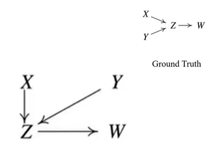 하지만 실제로는 $Y \rightarrow Z \rightarrow W$ 이므로 $Y \not\perp\!\!\perp W$, $Y \perp\!\!\perp W | Z$가 될 것입니다. 즉 $Z$, $Y$, $W$는 Immorality 구조가 아닙니다.